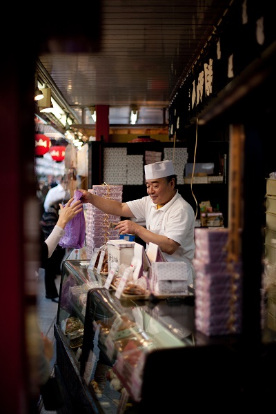 오타루 제일의 번화가 사카이마치거리에 있는 유리공방과 과자거리(사카이마치도리)