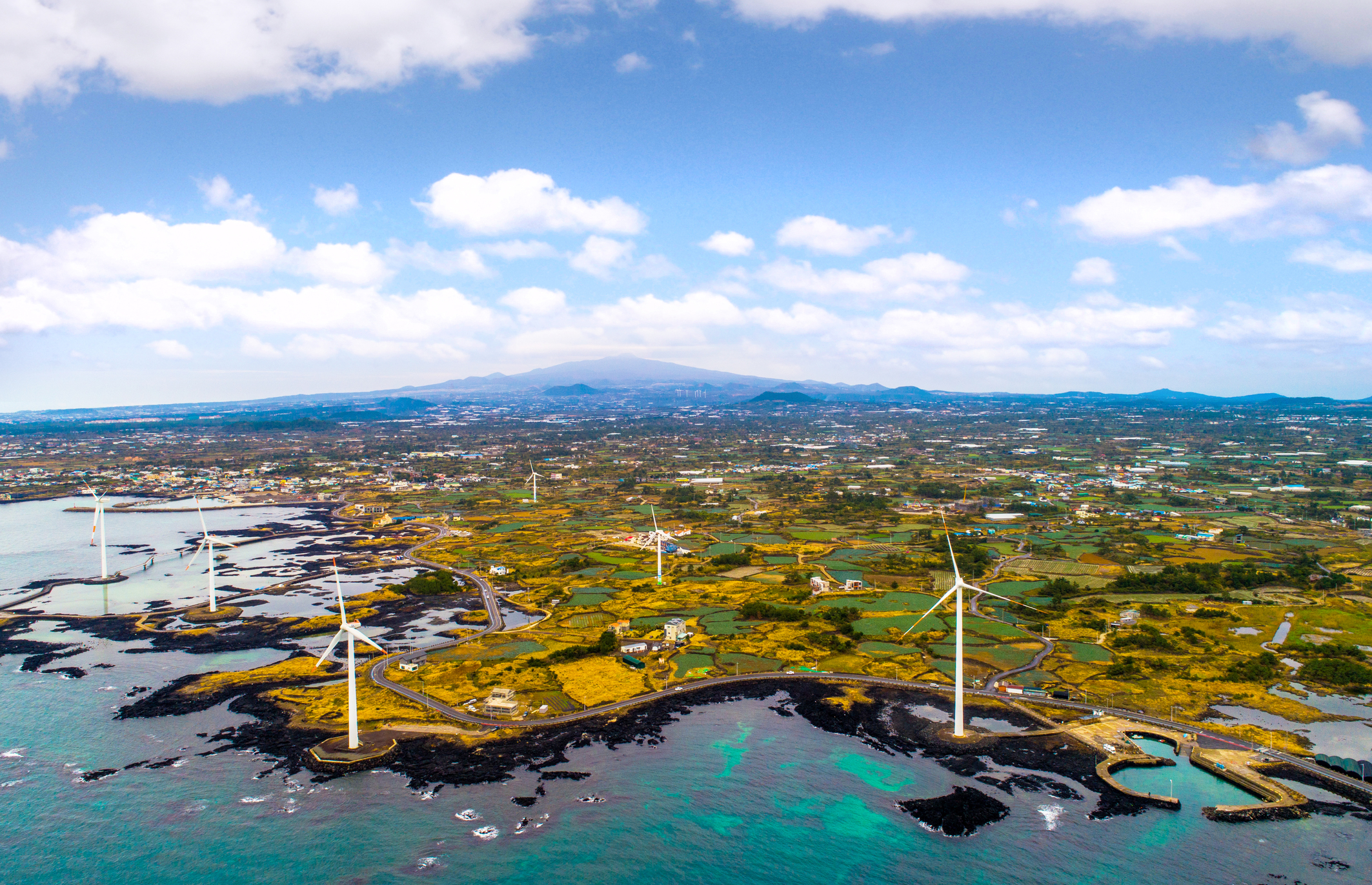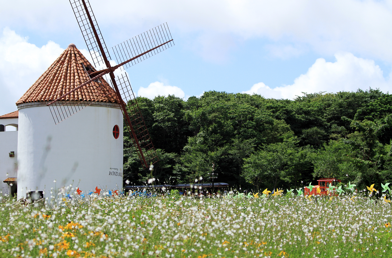 "윙윙" 거리며 돌아가는 커다란 풍력발전기와 함께 해안으로 이어지는 매력적인