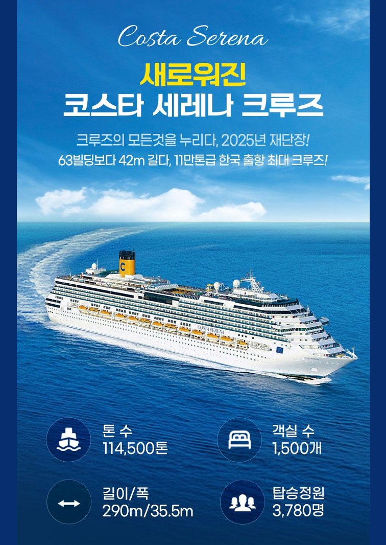 [서산출발] 613일 출발확정 한국. 일본. 대만. 3개국 크루즈 '코스타 세레나호'로 떠나는 7일 바다 위에서 시작되는 가장 품격 있는 여행 [럭셔리 크루즈]